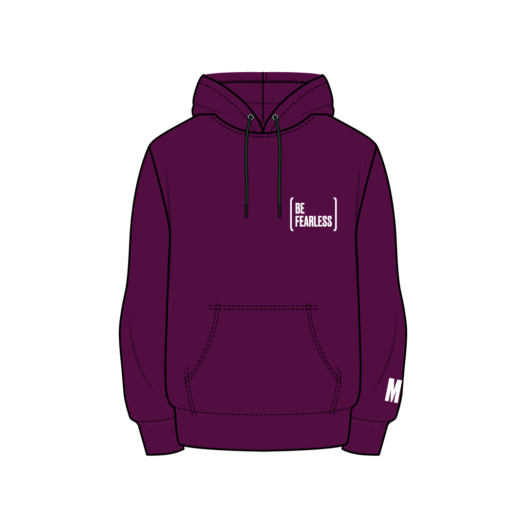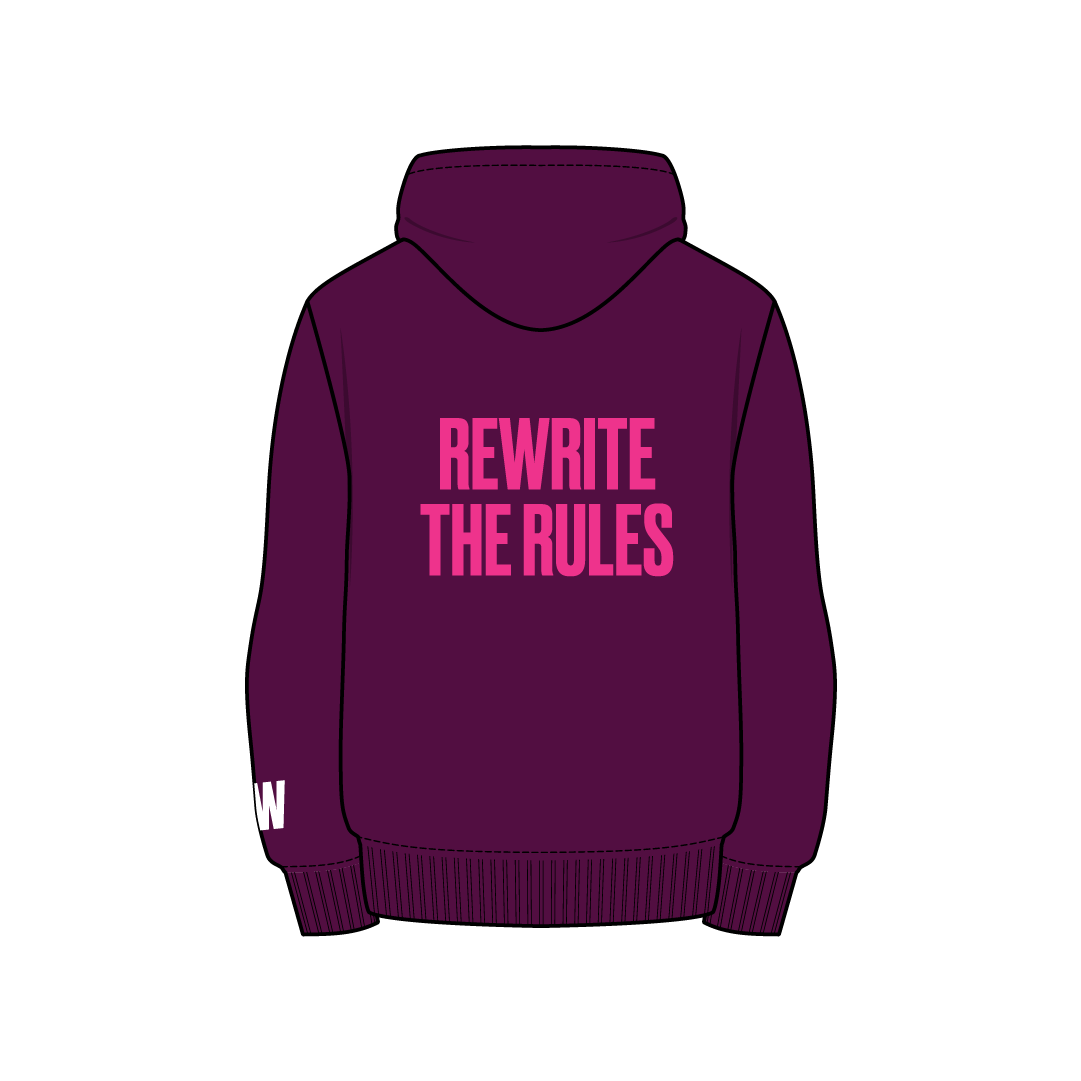 • Purple hoodie with bright pink ‘Rewrite The Rules’ text on back, white ‘MW’ text on cuff and ‘Be Fearless’ text on front in white