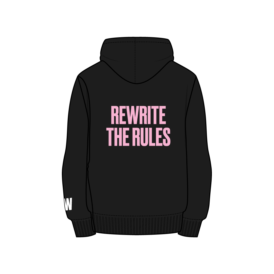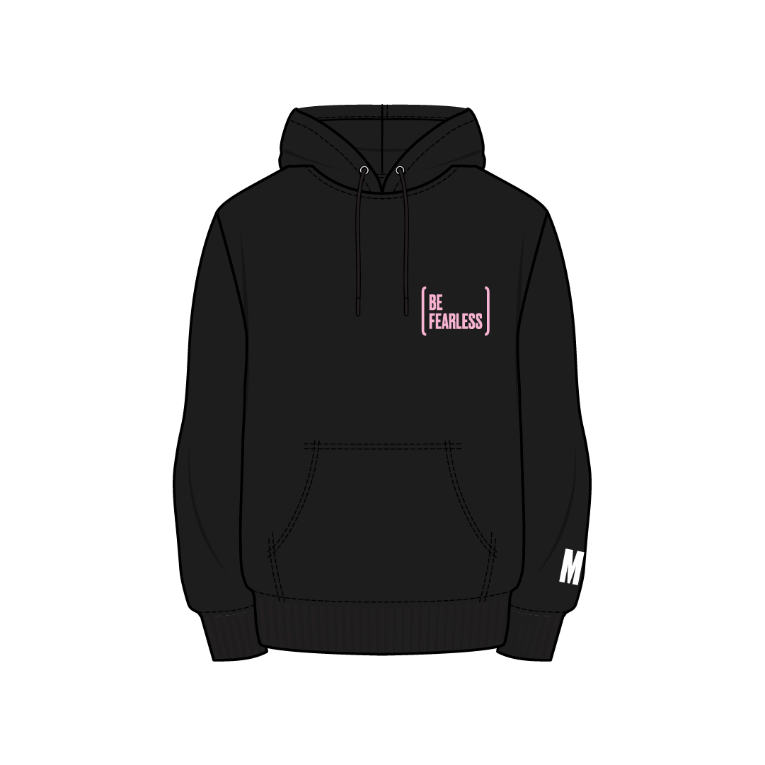 • Black hoodie with baby pink ‘Rewrite The Rules’ text on back, white ‘MW’ text on cuff and ‘Be Fearless’ text on front in baby pink